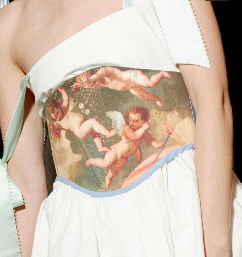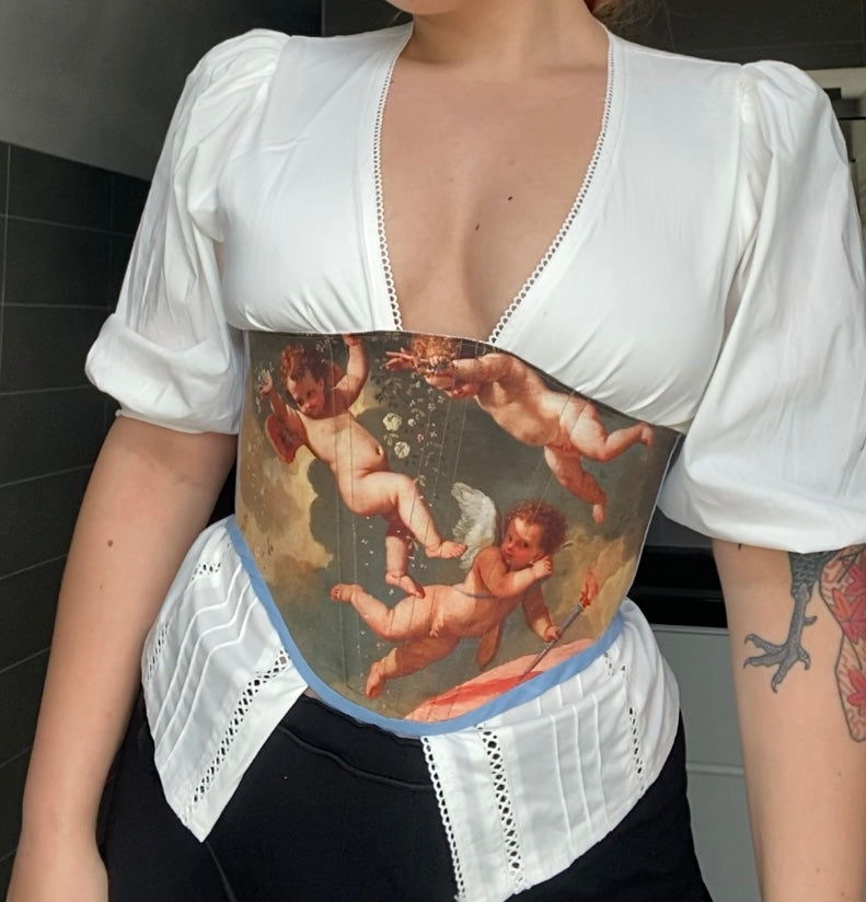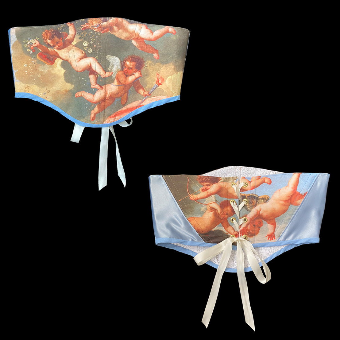 floral angel pattern in orange, green, yellow, beige, brown and blue