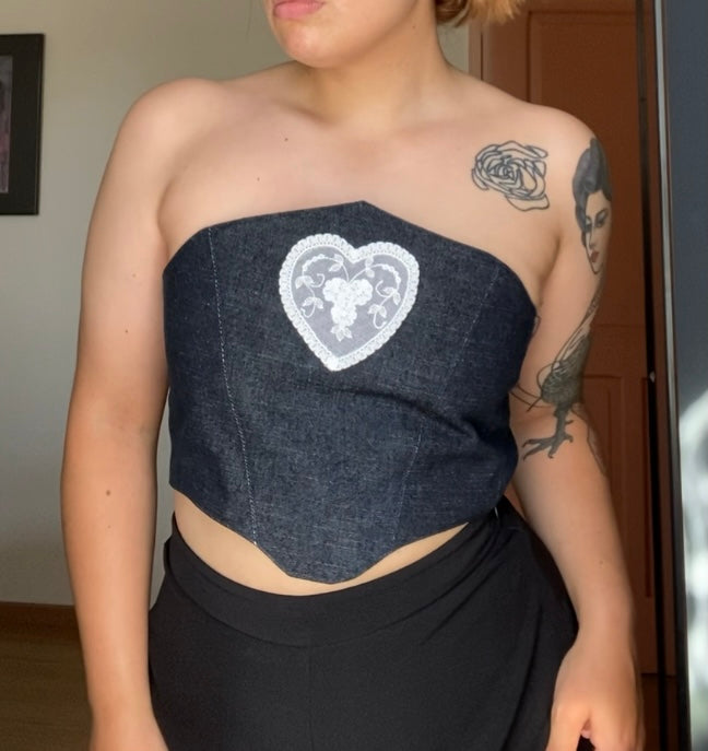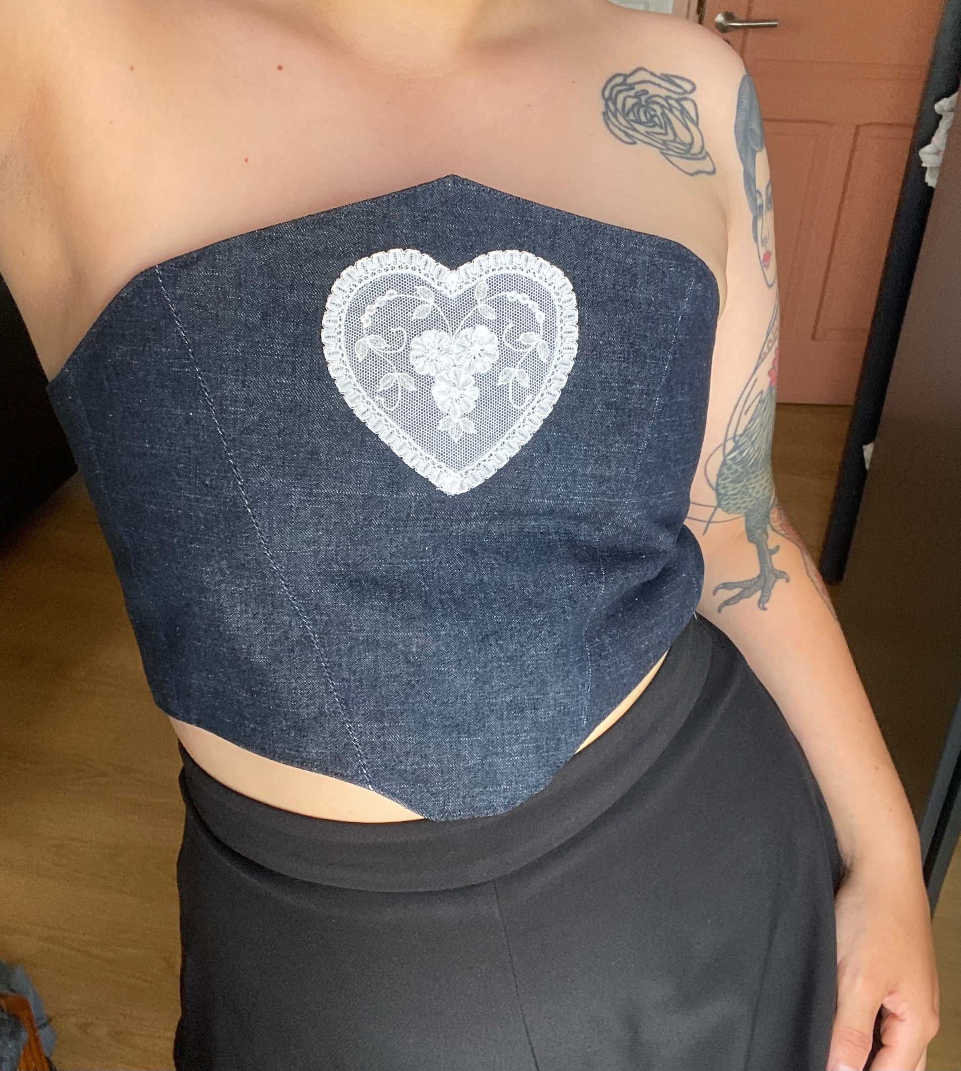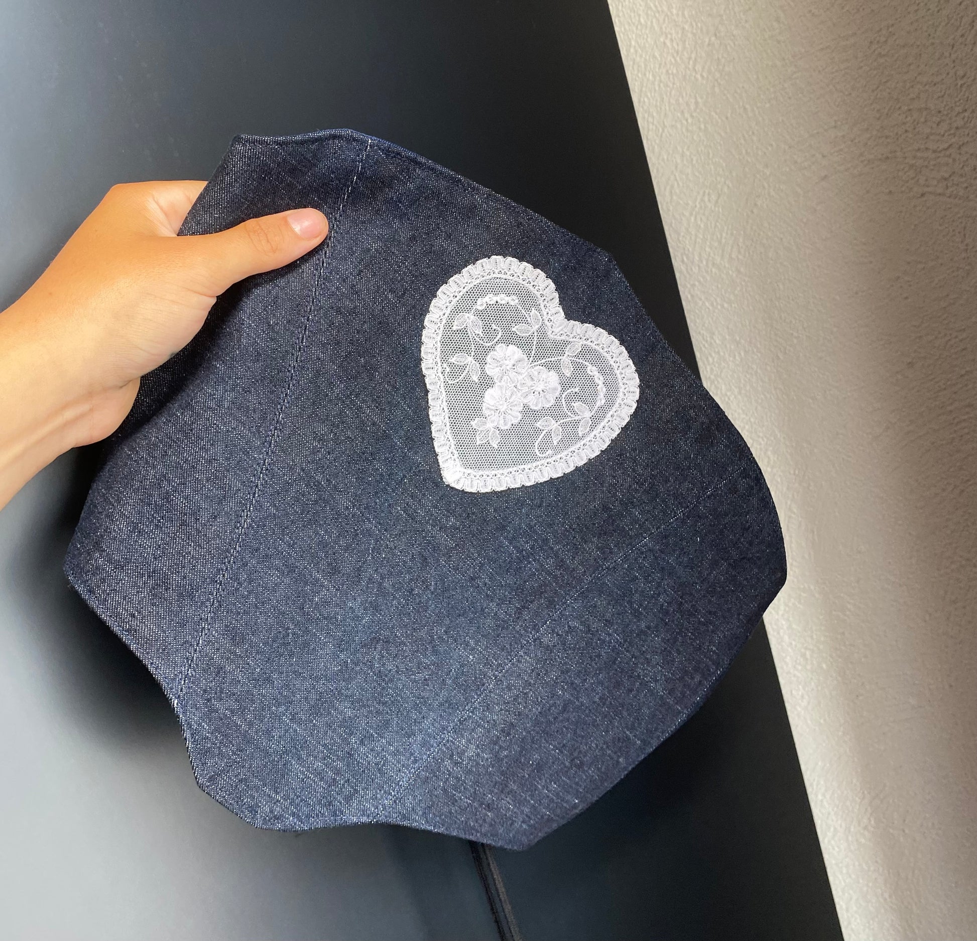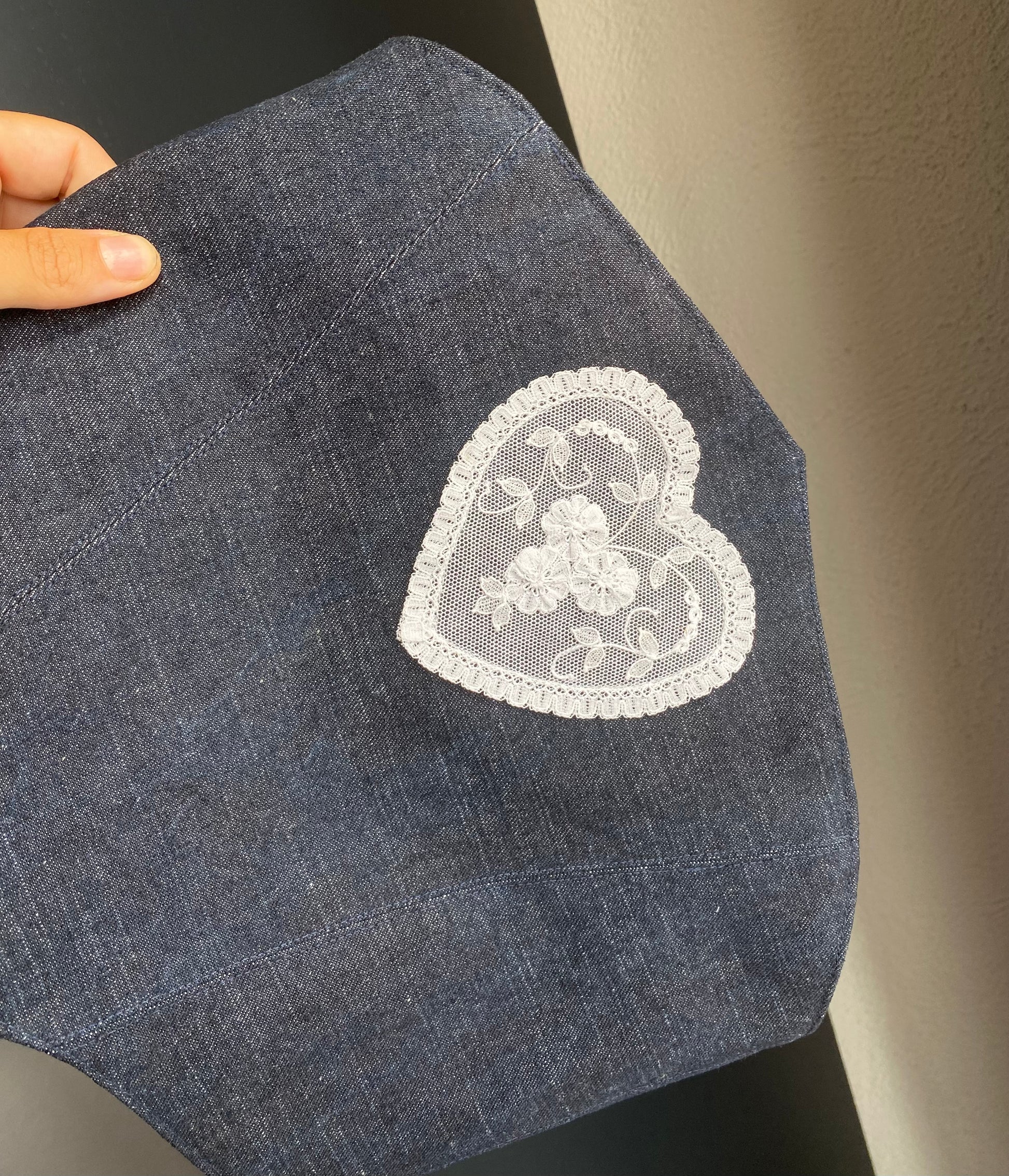 recycled from framed lace, tablecloth and combined with denim from the local fabric store