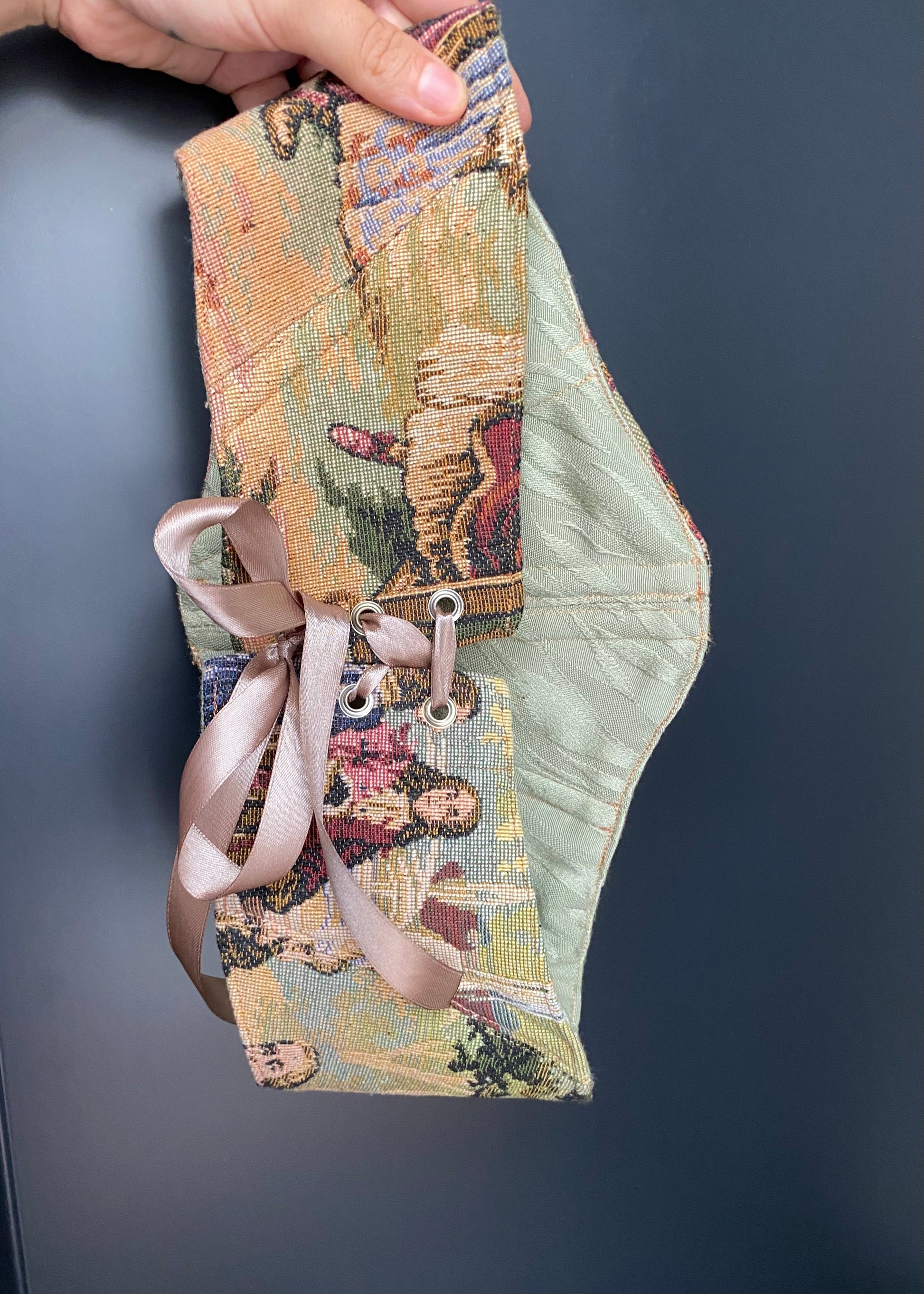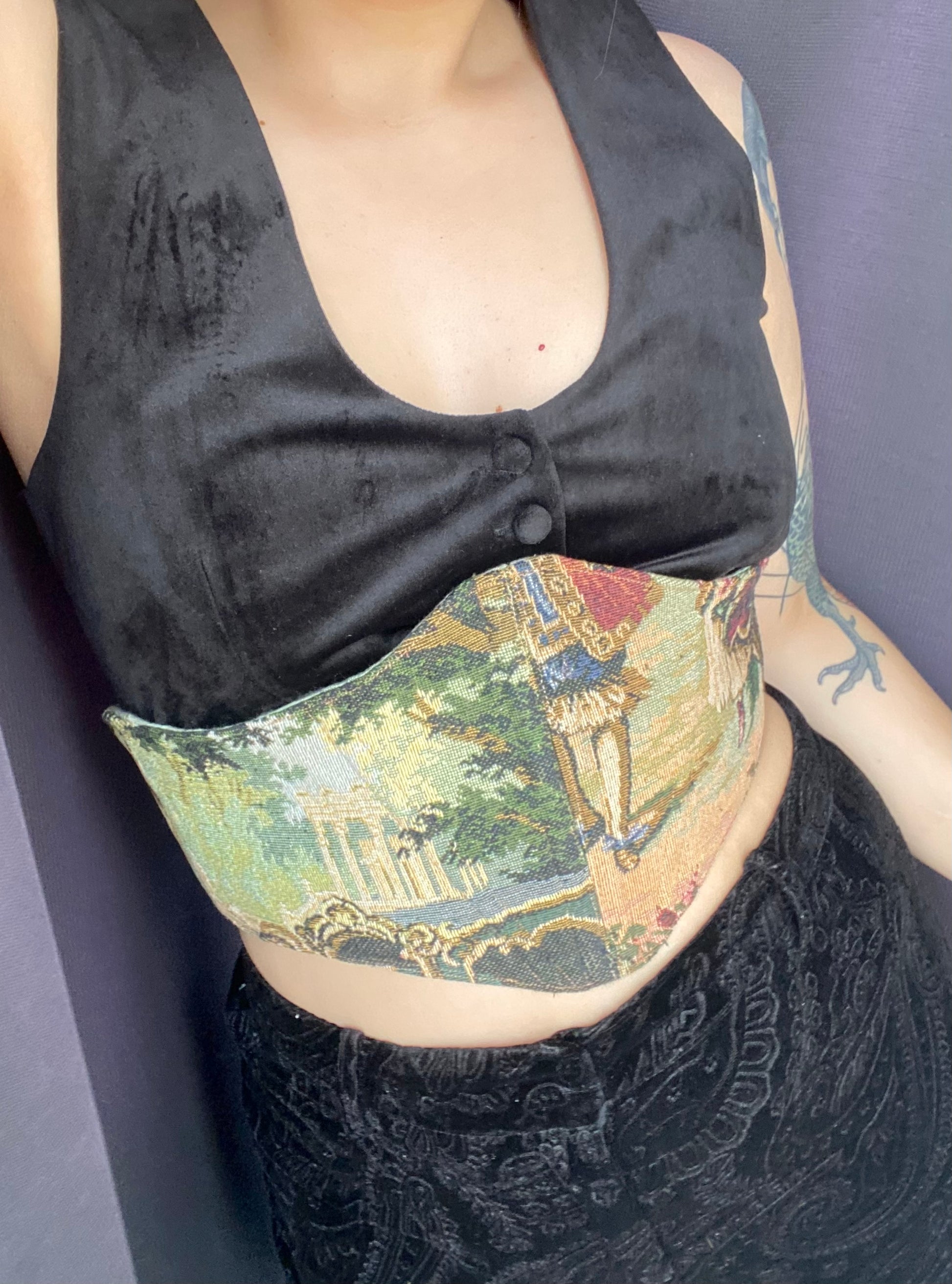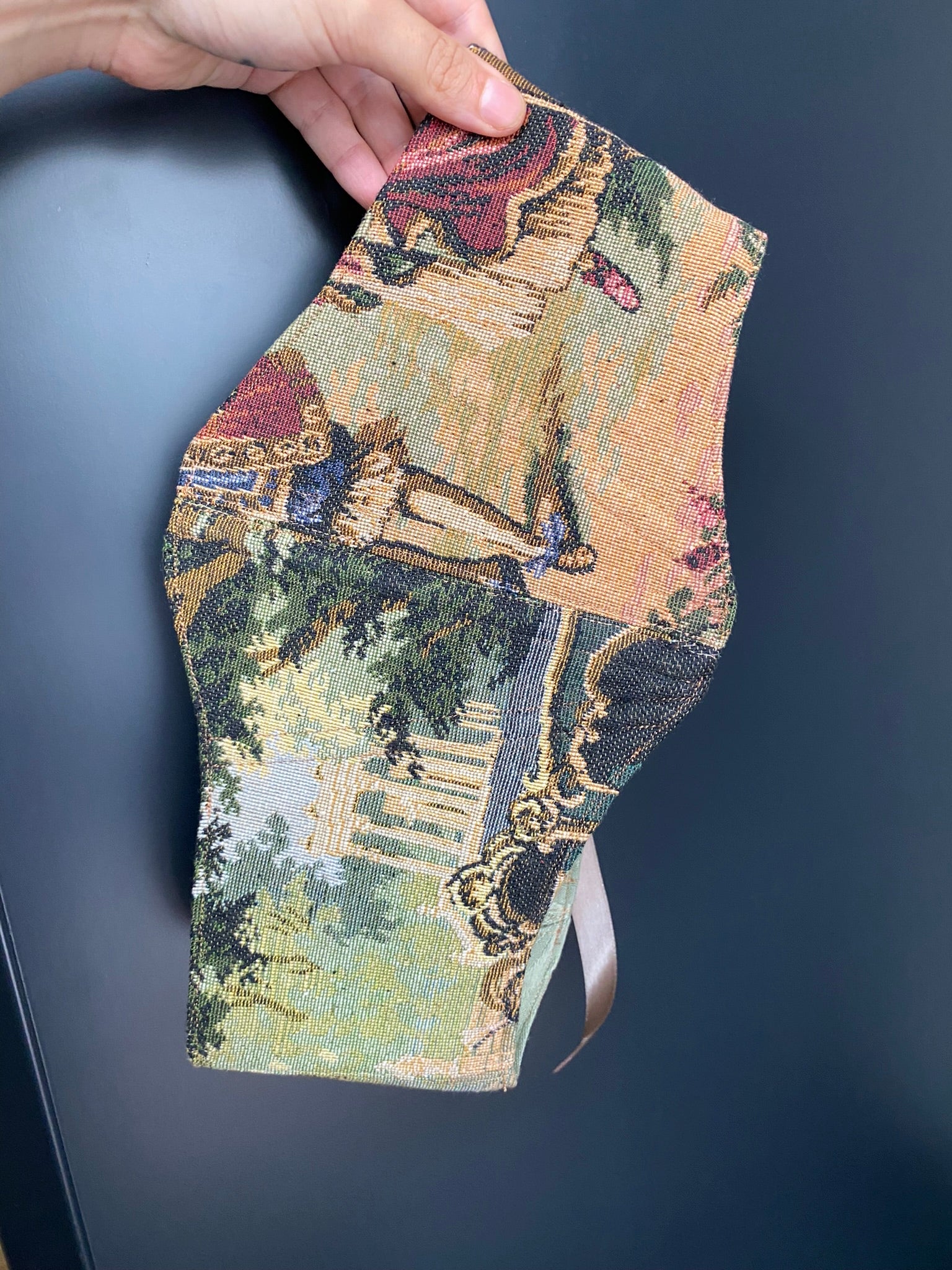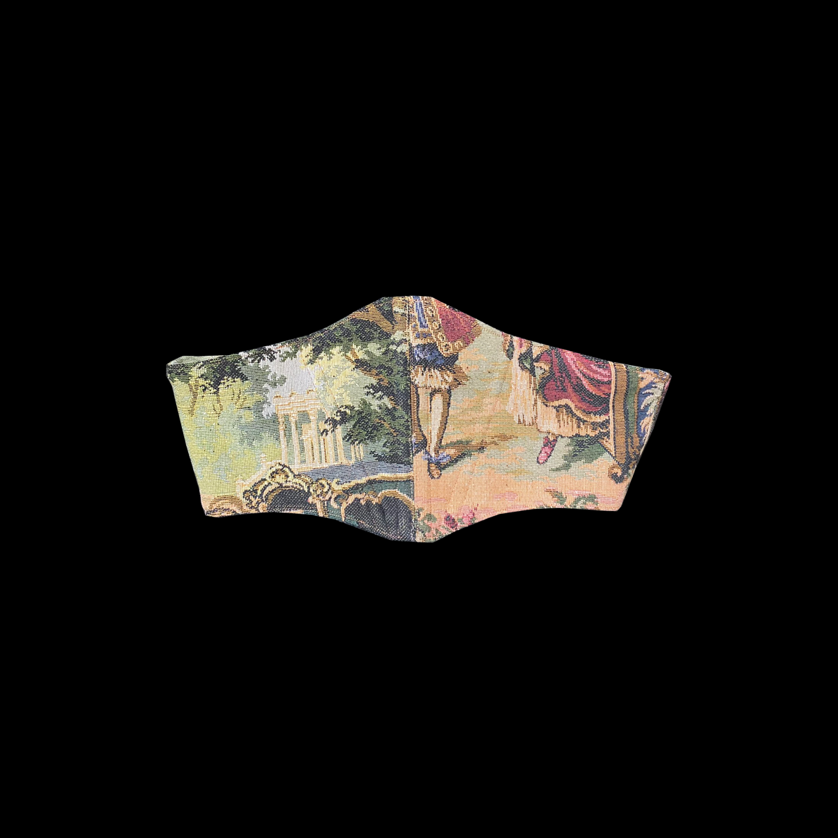 garden scene in cream, green, orange, blue, pink, red and purple tones