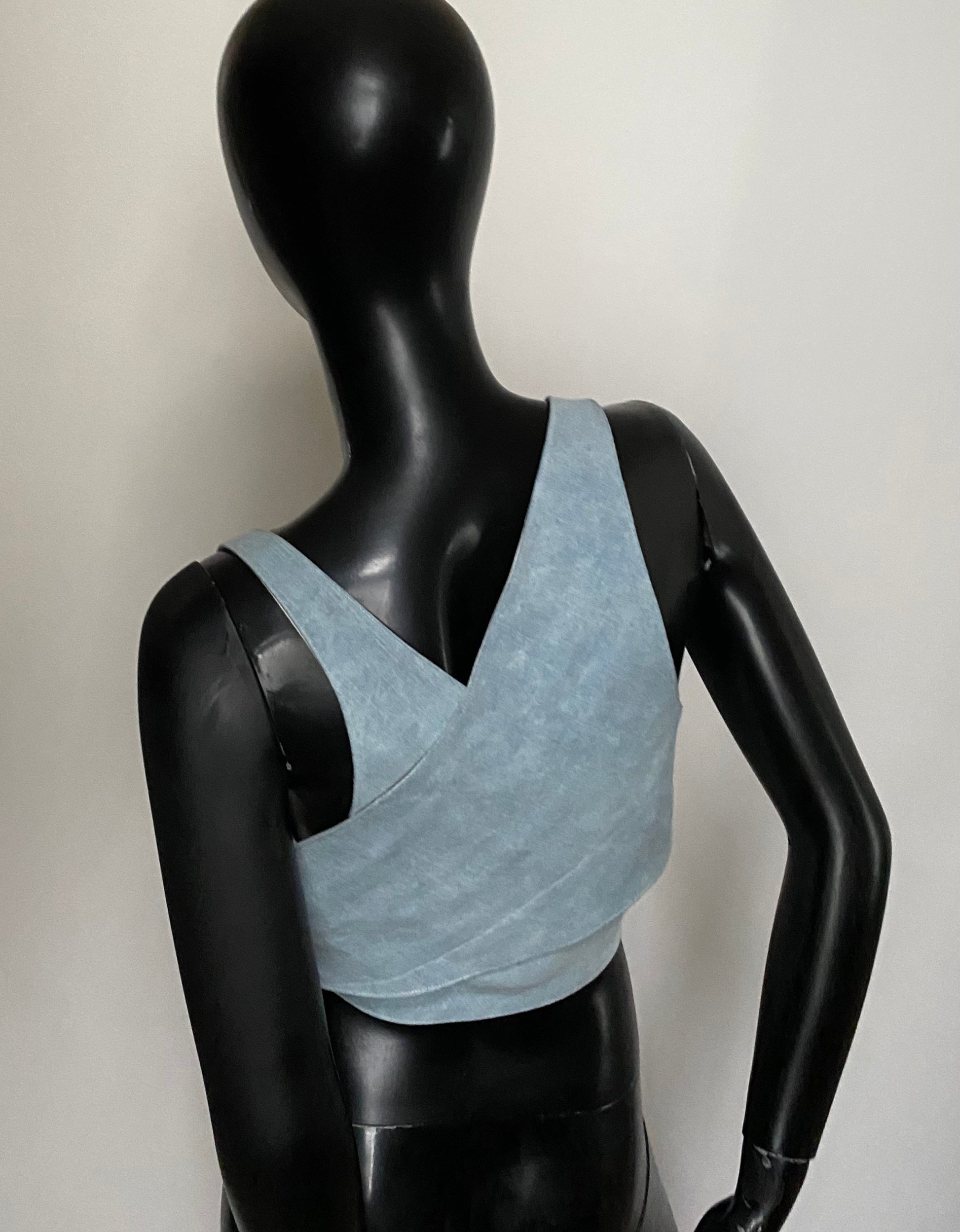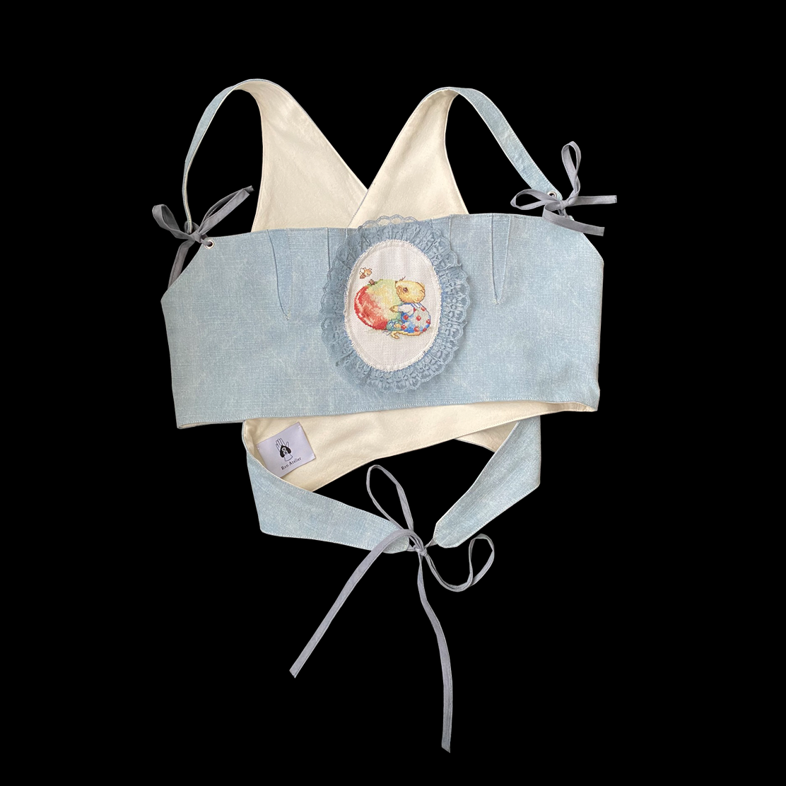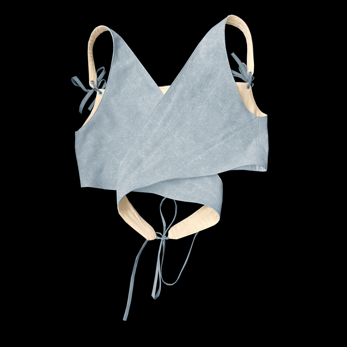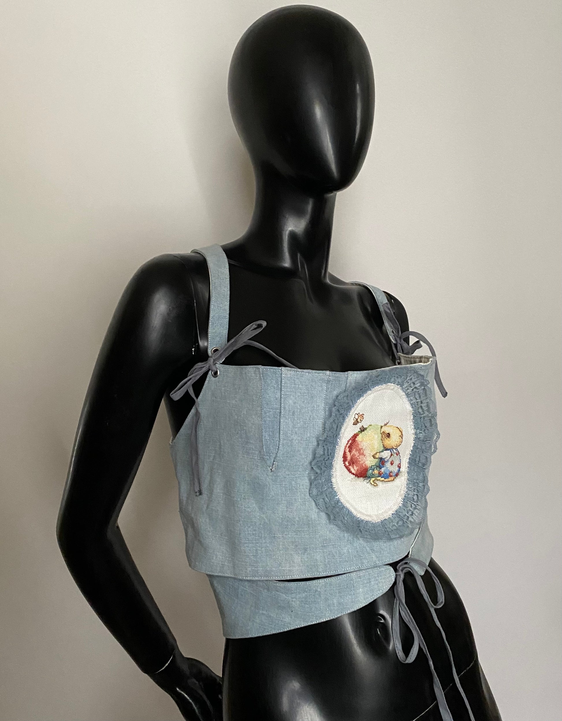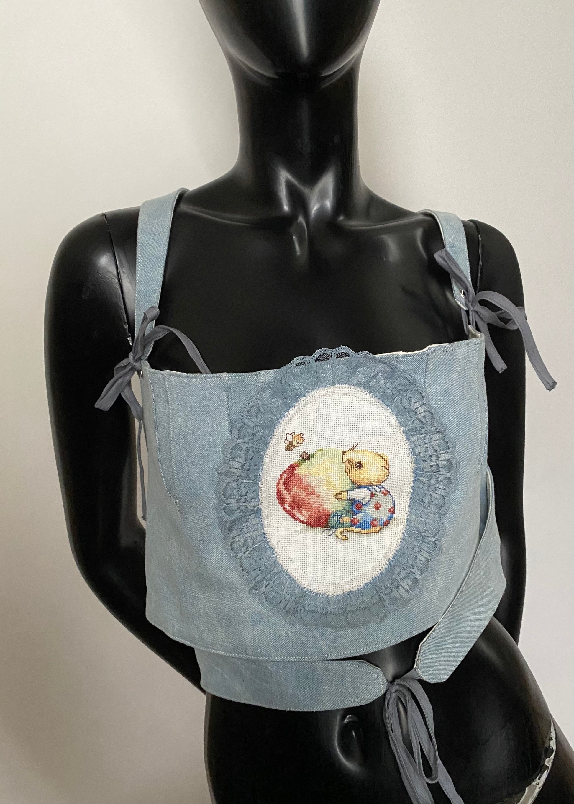 non-boned denim wrap stays with pleated cups and hand embroidery